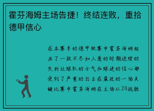 霍芬海姆主场告捷!终结连败,重拾德甲信心