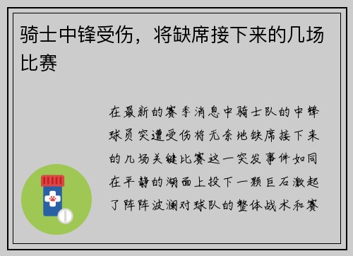 骑士中锋受伤,将缺席接下来的几场比赛